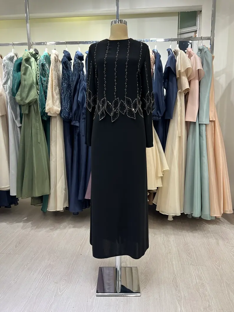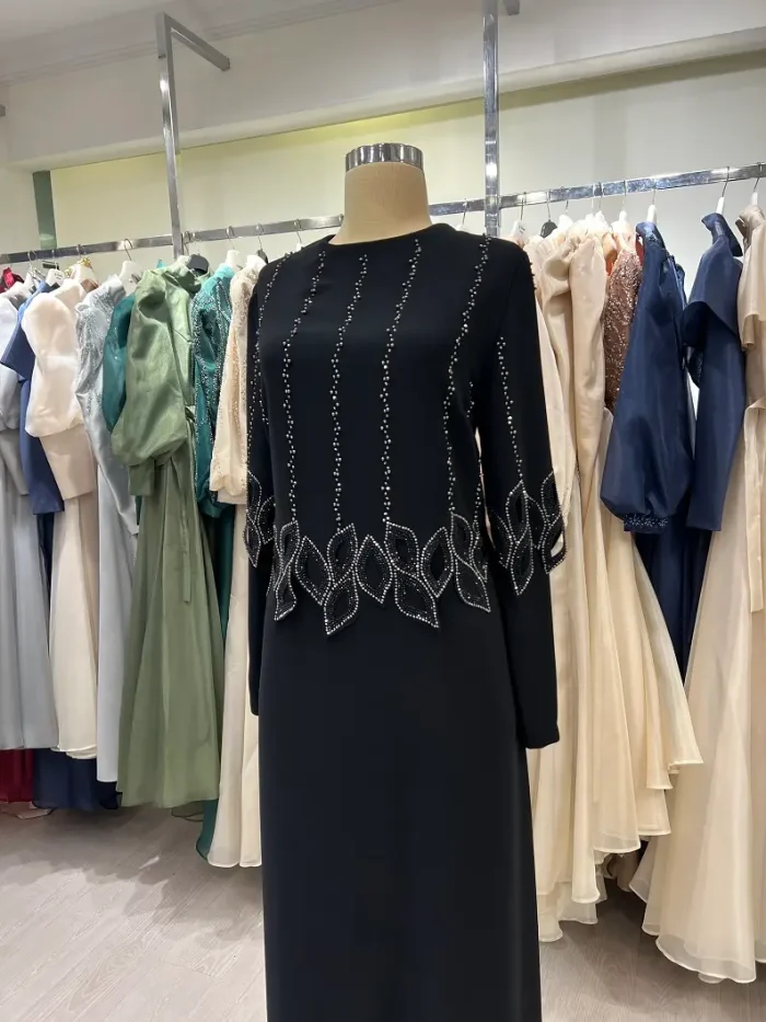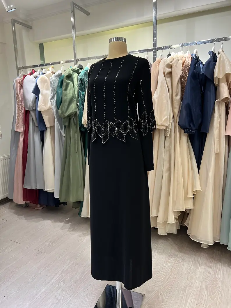 Sade şıklığı zarif detaylarla buluşturan bu siyah tesettür abiye elbise, dikey taş işlemeleri sayesinde vücuda daha uzun ve dengeli bir siluet kazandırır. Düz kesim yapısı ile rahat bir kullanım sunarken, bel ve etek bölümünde yer alan geometrik taş detayları elbiseye modern bir zarafet katar.