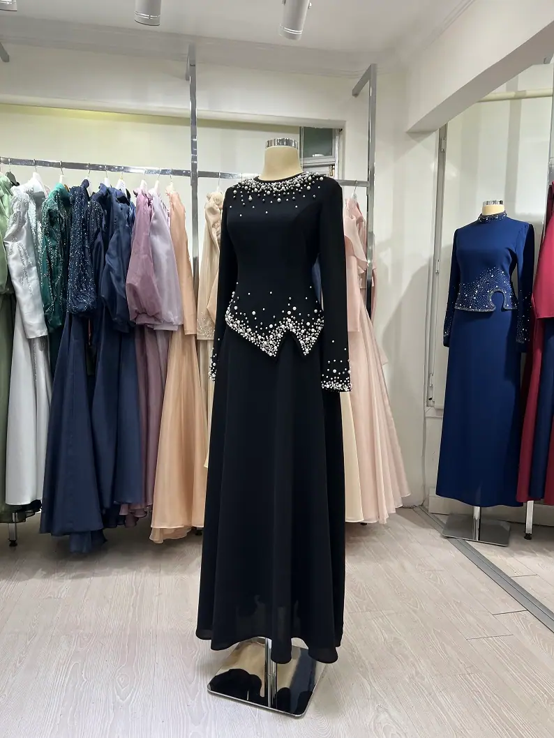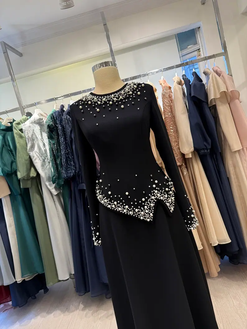 Şıklığı ve zarafeti bir araya getiren Siyah inci Taş işlemeli Duble Krep ikili Abiye Takım, özel davetlerde sade ama etkileyici bir görünüm isteyen kadınlar için tasarlanmıştır. Üst ve etekten oluşan bu zarif ikili takım, özellikle söz, nişan, düğün ve kına gecesi gibi özel günlerde tercih edilebilecek şık bir alternatiftir.